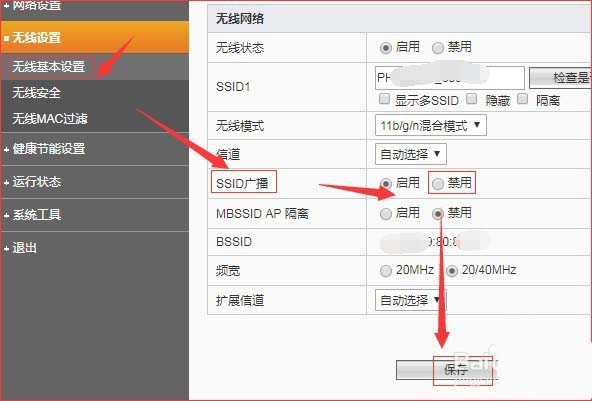 4、在“無線設(shè)置”中,點(diǎn)擊“無線基本設(shè)置”。然后在右側(cè)頁面中,找到“SSID廣播”,并選擇其右側(cè)的“禁用”,最后點(diǎn)擊“保存”生效。這樣設(shè)置無線網(wǎng)絡(luò),其他人就搜索不到了。