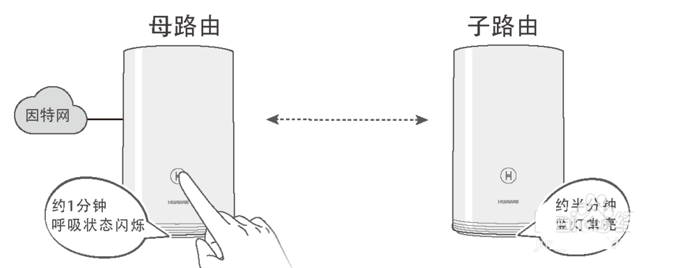 2、觀察母路由的指示燈,等待約1分鐘后它將自動變為呼吸狀態的閃爍,此時母路由發現子路由。點按一下母路由H鍵啟動配對,此時母路由指示燈閃爍加快,正在配對中。當子路由的指示燈變為藍色常亮時,即表示連接成功。