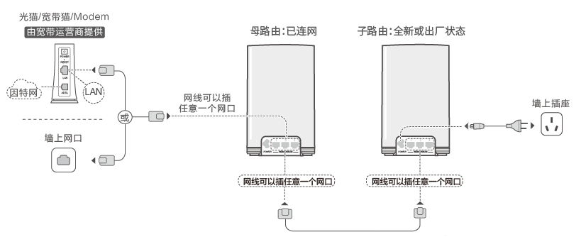 說明:有線組網模式下,作為母路由的第一臺華為路由Q2 Pro 必須接好上行網線才能組網成功。請您確保母路由已連接好上行網線且指示燈保持藍色常亮。