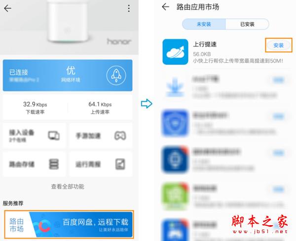 2、在首頁家居點擊您需要設置的路由器,進入路由器管理頁面。點擊“路由市場”,在未安裝列表中選擇“上行提速”,點擊“安裝”即可完成安裝。
