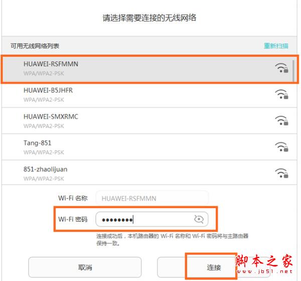4. 選擇老路由器的 Wi-Fi,并輸入老路由器的 Wi-Fi 密碼。單擊“連接”。中繼連接成功后,榮耀路由 Pro 的 Wi-Fi 名稱和密碼將變為老路由器相同,家里只有一個WiFi,但是有兩個信號源。