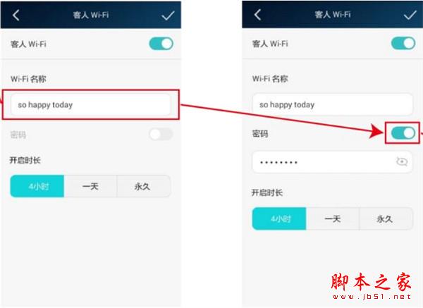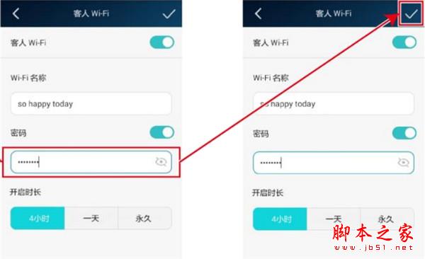 最后選擇客人wifi開啟的時(shí)長——4小時(shí)、一天或永久,最后再點(diǎn)擊右上角“√”按鈕保存設(shè)置,開啟客人wifi。