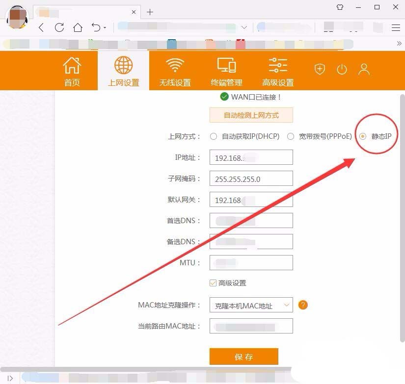 3、上網(wǎng)設(shè)置窗口中,設(shè)置WAN口連接為靜態(tài)IP,在下面的選項(xiàng)中輸入好各參數(shù)。