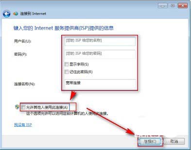 3、輸入:用戶名和密碼 --》運(yùn)營(yíng)商提供的撥號(hào)用的用戶名和密碼,在“連接名稱”中輸入撥號(hào)連接名稱(可以自定義),允許其他人使用此連接。