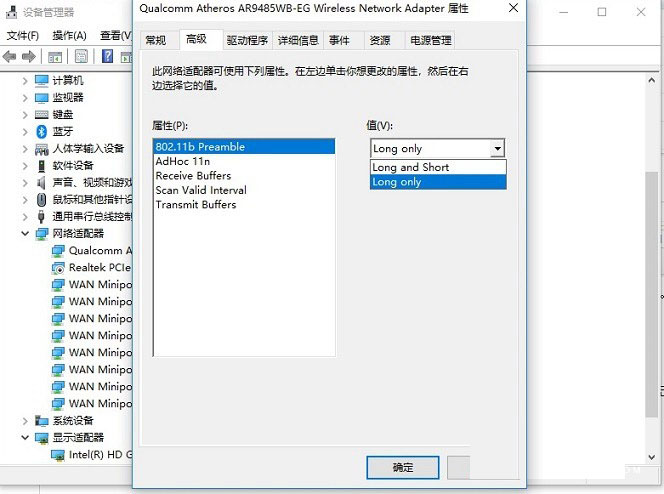 三、打開無線網(wǎng)絡(luò)屬性之后,切換到“高級(jí)選項(xiàng)”,然后點(diǎn)擊左側(cè)的 802.1 相關(guān)選項(xiàng),然后將右側(cè)默認(rèn)的“Long and Short”改為“Long only”,之后點(diǎn)擊底部的“確定保存”。