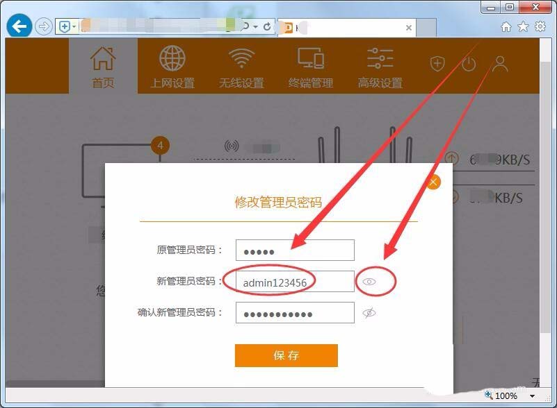 7、單擊密碼后的眼睛,可以顯示密碼,單擊保存,斐訊路由器的密碼就設置好了。