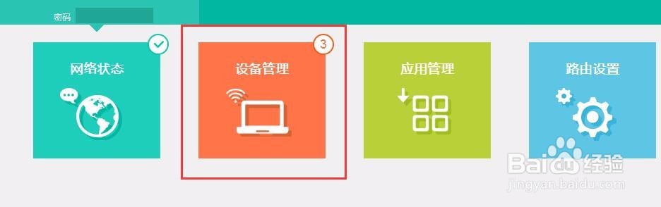3、進入路由器頁面后,左邊是網絡狀態,下拉右邊的進度條,看到下面有一個橘黃色的設備管理,點擊打開