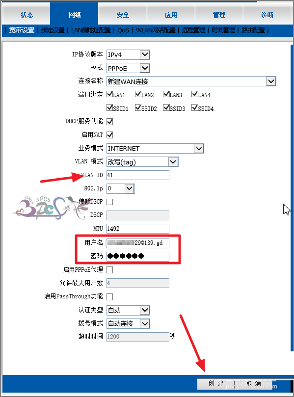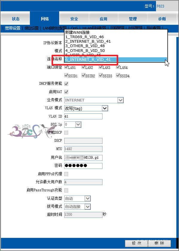 2、進入【網絡】--【帶寬設置】--【Internet連接】,新建一個WAN連接,模式選擇PPPoE,端口全選,并且VLAN ID設置改寫為41,填寫撥號賬號和密碼,保存。