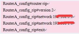 8、在路由器A上配置RIP動態路由協議,命令如下: