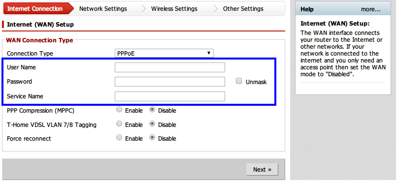 6、在下圖的藍色方框內輸入ISP(如電信等)給你的用戶名和密碼,“Service Name”一般不填,然后點擊“Next”。