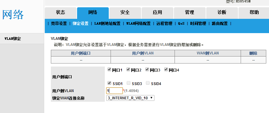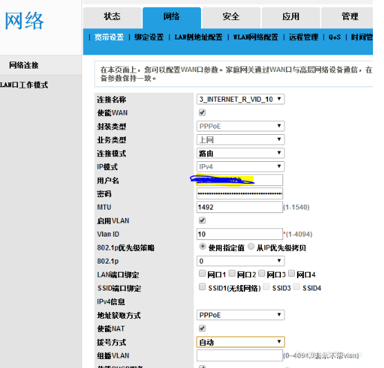 1、登錄web管理,超級(jí)用戶:telecomadmin、admintelecom、網(wǎng)絡(luò)-寬帶設(shè)置-新建,配制如下,用戶名、密碼是移動(dòng)給的,注意不要端口綁定。