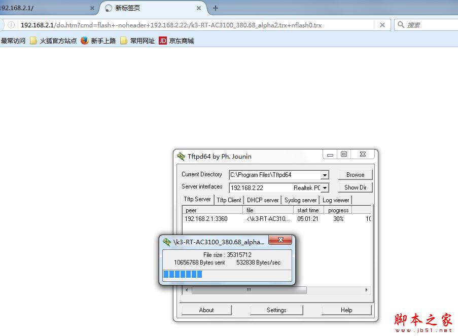 C:/Program Files/Tftpd64這個目錄,是放要刷的梅林固件的目錄,你也可以把固件放在其它地方,設置一下固件所在的目錄就行。下方的192.168.2.22就是電腦網卡的IP地址,選擇一下便行。設置好這2個地方后,就在瀏覽器地址欄輸入下面的地址: