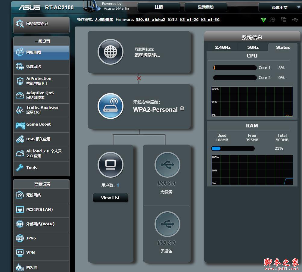 斐訊K3刷的這個梅林固件,是華碩RT-AC3100的原版梅林固件,不是我們常說的帶有軟件中心可以安裝多種插件的改版梅林。但畢竟也豐富了一些功能和應用。例如雙wan和USB服務中心,還有本人常用到的家長電腦控制程序,方便控制設備的上網時間。