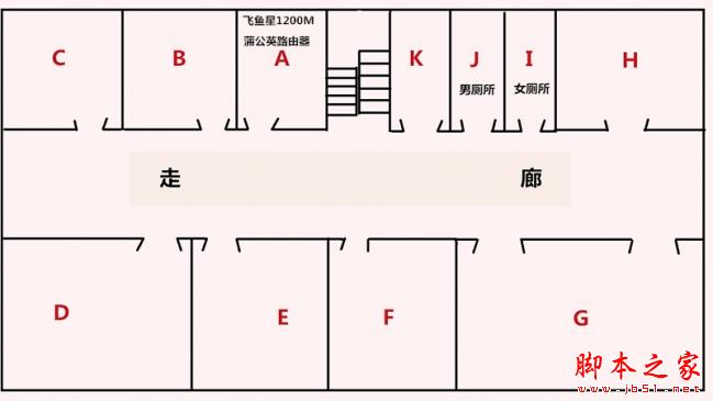 為了能有個參照對比,這里我使用了一款百元級的針對企業用戶的蒲公英路由器進行對比。從下圖可以看到,我把飛魚星VW1200和蒲公英路由器擺放在A點辦公室,這里布滿了將近300臺電腦。另外,這棟樓里充滿了許多wifi信號,一般來說wifi信號超過三個以上就會對2.4G頻段造成影響,那么這兩款路由器的表現如何呢?