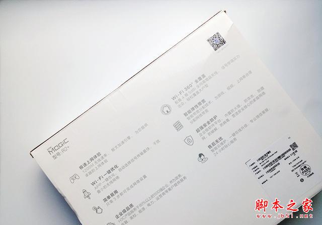包裝背面印有路由的幾大特點:極速上網體驗、WIFI一鍵優化、企業級品質、wifi360°全覆蓋、智能彈性帶寬、超強安全防護、售后無憂。背面下方則是版本條碼以及廠家信息。