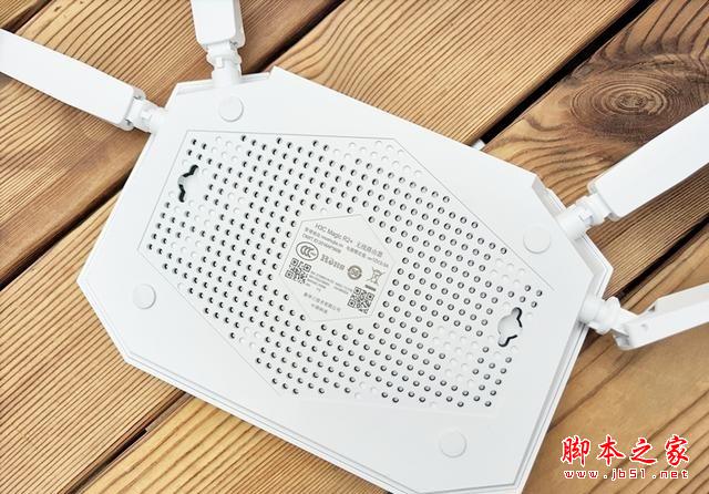 華三Magic R2+采用了路由的經典設計,扁平機身加4根角度可調的外置天線。路由整體呈白色,機身為了八邊形造型,中間凸起,四周略低,正中有英文子母“M”,稍稍有點UFO的感覺。“M”的中心有個小圓孔,狀態指示燈隱藏其中,工作時呈黃綠色。