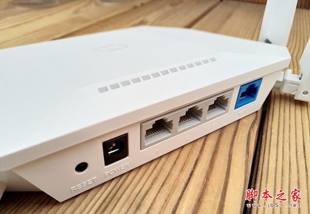 接口都集中在路由后方,從左至右依次為重啟鍵、電源接口、三個局域網千兆接口和復位鍵。