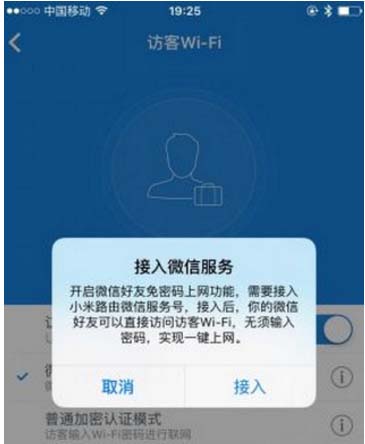 2、彈出提醒“接入微信服務(wù)”,然后選擇“接入”,即可關(guān)注小米路由器的公眾號