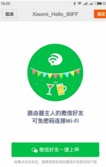 3、好友如果使用 Android 手機,選擇剛才設(shè)置的“訪客網(wǎng)絡(luò)”,默認名字是“Xiaomi_Hello_XXXX”也可以自定義。此時彈出認證頁面,點擊“微信好友一鍵上網(wǎng)”按鈕。