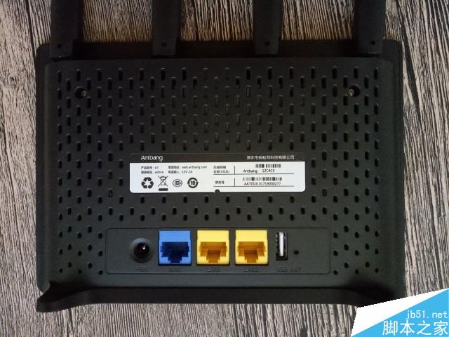 在路由背面設(shè)計了所有的插孔,從左到右依次是電源接口、WAN接口、2個LAN接口、USB接口以及reset孔。此外在背面的銘牌上我們可以看到路由器的一些基本信息。