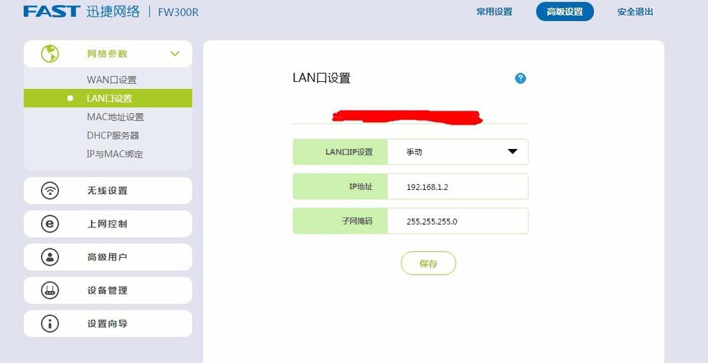 4、設置完成后,進入到LAN口設置,ip設置為手動,然后在ip地址項輸入IP地址,這里要注意,這個看你主路由器上邊的ip地址是多少,如果是192.168.1.1,那你這個就填192.168.1.2,如果主路由器是192.168.2.1,那你就填寫192.168.2.2,以此類推,子網掩碼就寫255.255.255.0,然后保存