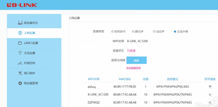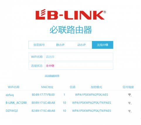 3、作為無線中繼使用后,路由器會自動搜索周邊的WiFi信號,并在頁面的下方顯示。