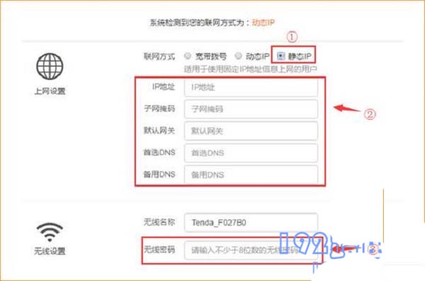 (3)、當檢測到聯網方式是:靜態IP ——>需要在頁面中填寫:IP地址、子網掩碼、默認網關、首選DNS、備用DNS——>然后接著設置:無線名稱、無線密碼——>最好點擊“確定”。