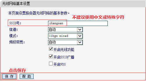 登錄管理界面后,點(diǎn)擊 無線設(shè)置 >> 基本設(shè)置,修改SSID號(hào)(即無線網(wǎng)絡(luò)名稱),其他設(shè)置保持默認(rèn),點(diǎn)擊 保存。如下: