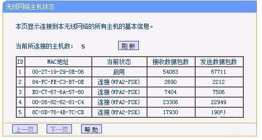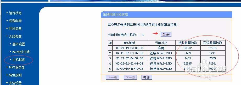 5、登陸無(wú)線路由器后,我們點(diǎn)擊無(wú)線參數(shù),然后點(diǎn)擊主機(jī)狀態(tài);在右邊可以看到主機(jī)狀態(tài)收發(fā)數(shù)據(jù)包信息,這個(gè)最關(guān)鍵,可以點(diǎn)擊刷新來(lái)查看對(duì)方使用的多少KB每秒的速率。