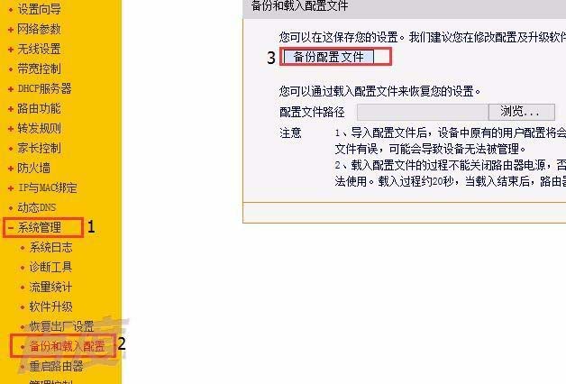 1、為了后期使用的方便,建議先做一下設置的備份,進入系統管理中的備份和載入配置,進行操作。