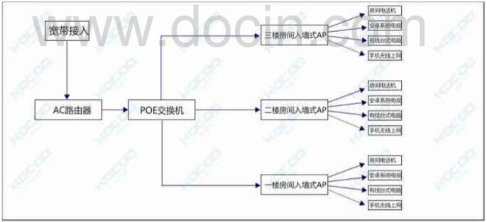 考慮別墅的環境特征,墻壁對信號屏蔽嚴重,隱藏節點多,維護工程量大,AP之間信道功率無法調節管理,干擾嚴重,AP安裝與房間裝修環境不相稱,影響美觀,隨著現代科技的高速發展,很多家庭都裝有安卓系統電視機,如果每個房間只有一個網絡插口,當需要看網絡電視的時候,就必須拔掉筆記本電腦或臺式電腦網線,這樣會導致不太方便且使網絡可靠性大為降低。在這里我們推薦使用小型路由器和ET953N入墻式AP的配合使用,使整個布置美觀大方如下圖: