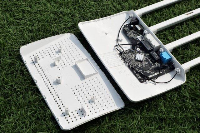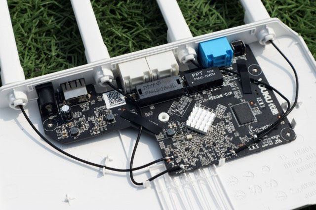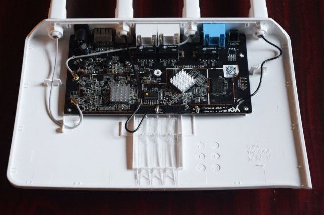 優(yōu)酷路由器X1底部也是只有一顆螺絲固定,拆解上極為方便。從下圖也可以看到,PCB板其實(shí)面積很小,這樣內(nèi)部的空間也就更大,更有利于空氣的流通。