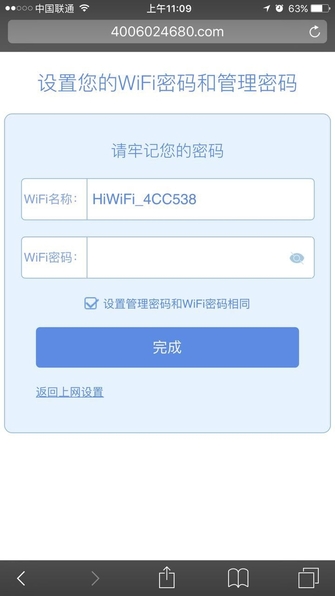 設置完成后,會進入設置WIFI的SSID界面,在這里設置無線密碼和管理密碼。為了方便,可以將無線密碼和管理密碼設置為相同,同樣你也可以單獨設置。