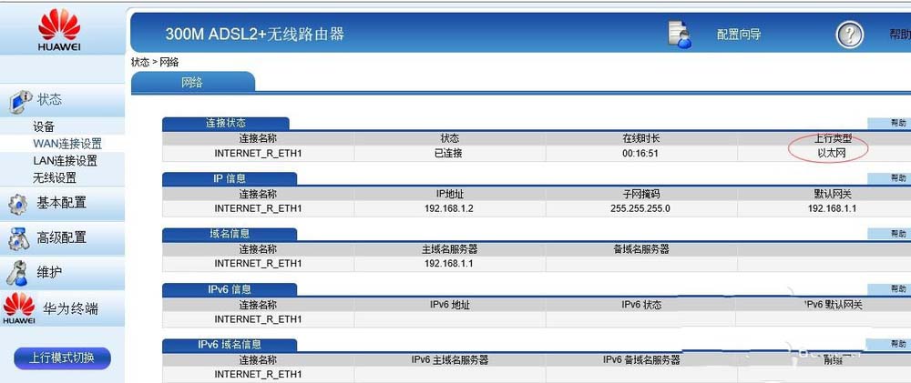2、在HG界面里點擊上行模式切換,這個以前沒有的,升級后才有的。切換后會把LAN1接口變為WAN接口。WAN連接設置顯示上行模式:以太網。