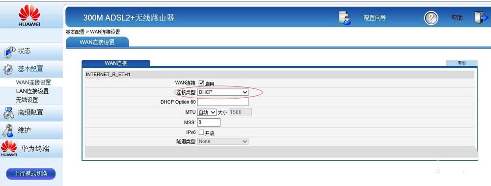 3、把HG的 LAN1連接到光貓上,別的三個LAN接口隨便用一個連接到電腦上。路由器的指示燈: internet、WLAN、LAN1及任意其他LAN等4燈亮且閃爍。在電腦上HG界面,還是192.168.1.1,進基本設置,去WAN設置,連接類型設為DHCP。不選PPPoe,不需設置寬帶賬號和密碼。
