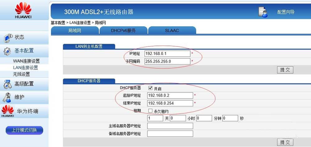 5、去LAN連接設置:IP地址192.168.0.1(設為192.168.1.1時上不了網),DHCP服務器開啟,地址設為192.168.0.2~254。設置好后,重啟路由器,登陸地址改為192.168.0.1