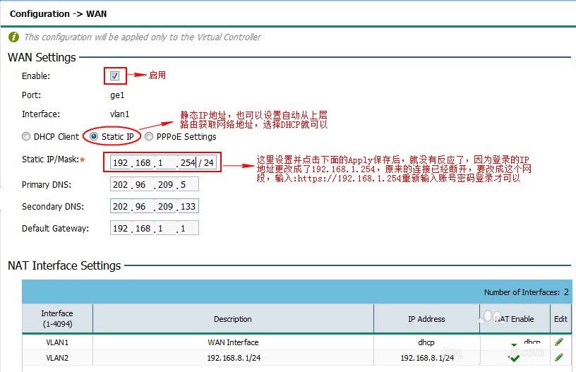 NAT Setting: 如果需要在用戶wlan和WAN口進行轉發數據, 那么就需要在wlan的相應vlan接口下開啟NAT功能。