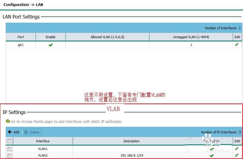 4、LAN配置,在Configuration ->LAN中可以對GE口的vlan以及vlan 的interface進行配置, 選中相應的接口后,點擊”edit”進行修改即可.
