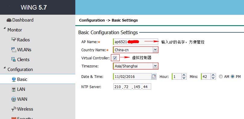 3、Basic配置,配置完成后,可點擊 “Apply” 按鈕即提交配置,這個界面主要是配置AP名字,所在城市,是否作為虛擬控制器等。