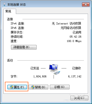 5、若 IP 地址和路由器的 IP 地址不在同一網段,則在“本地連接 狀態”對話框中,單擊“屬性”。