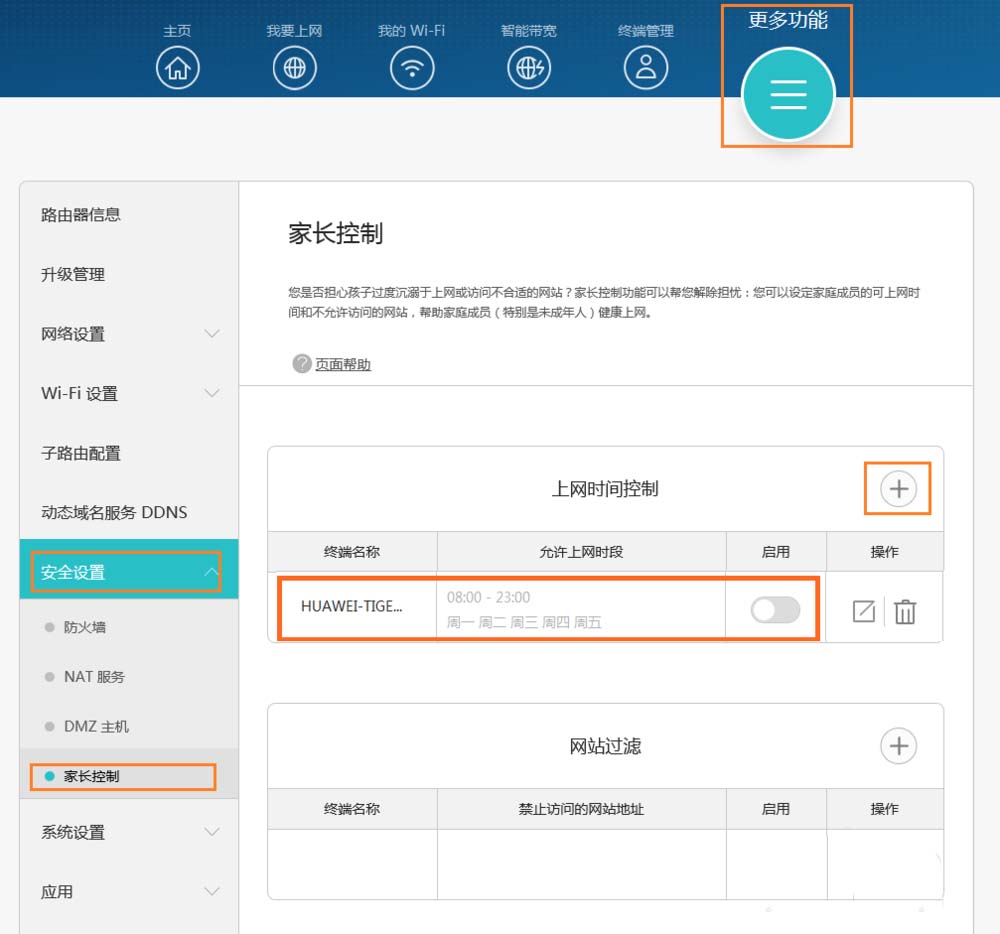 3、進入“更多功能 > 安全設置 > 家長控制”頁面。檢查不能上網的那臺電腦是否在“家長控制”的終端列表里。如果是,請關閉或刪除家長控制規則后,重新嘗試是否可以上網。