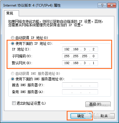 8、如果您關閉了路由器的 DHCP 服務器,則計算機將無法自動獲取 IP 地址,請手動設置計算機的 IP 地址,使其和路由器的IP地址在同一網段(如:192.168.3.2)。