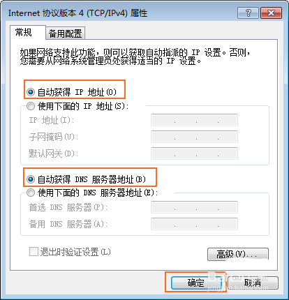 7、選擇“自動獲得 IP 地址”和“自動獲得 DNS 服務器地址”,單擊“確定”。