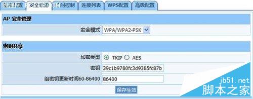 連接成功后進入路由器設置界面,可以看到在“無線配置”的“安全管理”選項里面已經加密成功了,并且使用的是安全性非常高的“WPA-TKIP”算法。