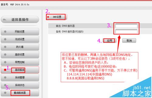 B、在路由器的【高級(jí)路由】-【DNS設(shè)置】中,配置好正確的DNS地址;再將電腦、路由器都重啟。