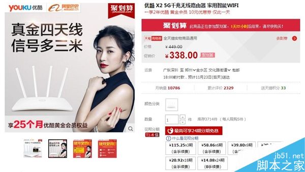 今天,該路由器在優(yōu)酷天貓旗艦店開(kāi)展活動(dòng),購(gòu)買(mǎi)路由器即送25個(gè)月優(yōu)酷黃金會(huì)員(價(jià)值357元)。而且支持24期0手續(xù)費(fèi)分期,相當(dāng)于每月花14.08元即可享有優(yōu)酷路由器和2年的優(yōu)酷黃金會(huì)員。