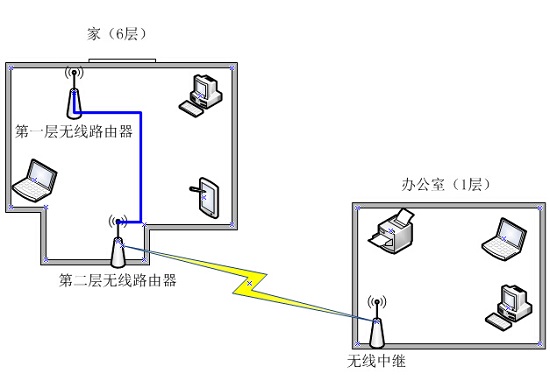 2.無線中繼。辦公室與家的距離相隔50米左右,中間有各種公共設施,并且不在同一樓層,所以只好采用無線中繼的方式。