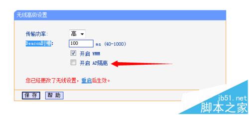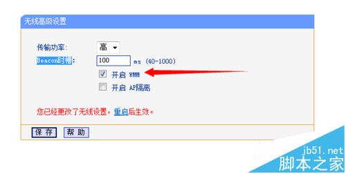 2、這里我們看一下傳輸功率,Beacon時槽,以及開啟wmm和ap隔離。首先這款無線路由器的功率是可調的,一般情況下,我們選擇功率為高,這樣無論是信號強度還是傳輸速率都會提高。