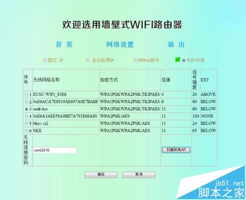 5、如果設置中繼功能選擇“WIFI中繼”然后點擊“掃描所有AP”選擇所要中繼的網線網絡名稱,輸入無線連接密碼,按“確定”后重啟路由器即可