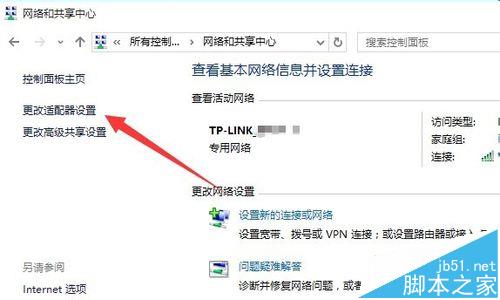 2、從打開的“網(wǎng)絡(luò)和共享中心”界面中,點(diǎn)擊窗口左上角的“更改適配器設(shè)置”按鈕,即可進(jìn)入“網(wǎng)絡(luò)連接 ”界面。